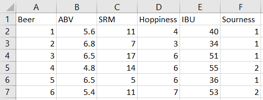 ...but that's pretty big, so let's break it down.Step 1Start with your beer dataset. Create one dataset of the benchmark beers that you know and love, with one row per beer and one column per factor (I've just generated some numbers here which will roughly - very roughly - reflect mid-strength, fairly hoppy, not-too-dark, not-insanely-bitter beers):