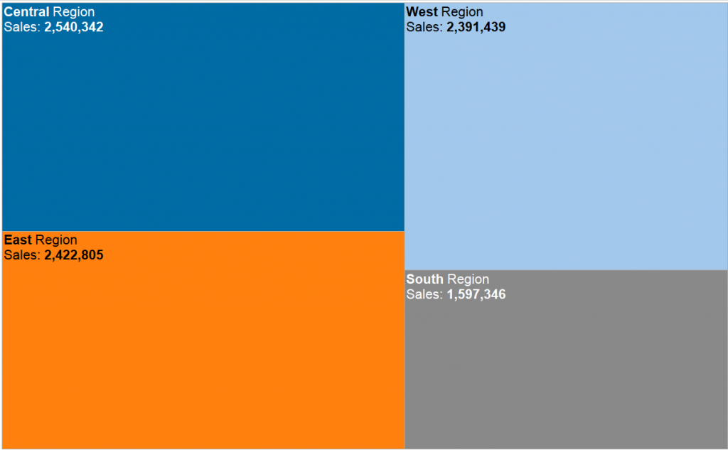 Introduction to treemapsBar charts are surely well know but let’s spend a few words on treemaps now. A treemap is a chart type that displays hierarchical or part-to-whole relationships via rectangles. In case of hierarchical (tree-structured) data these rectangles are nested. The space in the view is divided into rectangles that are sized and ordered by a measure. Nested rectangles mean that hierarchy levels in the data are expressed by larger rectangles (above in the hierarchy) containing smaller ones (below in the hierarchy).The rectangles in the treemap range in size from the top left corner of the chart to the bottom right corner, with the largest rectangle positioned in the top left corner and the smallest rectangle in the bottom right corner. In case of hierarchical data - when the rectangles are nested -, the same ordering of the lower level rectangles is repeated within each higher level rectangle in the treemap. So the size, and thus the position of a rectangle that contains other rectangles is determined by the sum of the areas of the contained rectangles.Let’s see now an example of a treemap showing part-to-whole relationships and a nested treemap from hierarchical data.(All the charts will be built on the 'Superstore data' provided with Tableau Desktop and will be using consistently the Sales measure for the sake of simpicity.)A) Simple, 'part-to-whole' treemap (1 dimension only, now Region)
