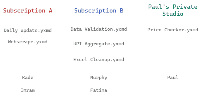 In Alteryx Server, every user and their workflows are scoped to a single subscription (formerly studios), and (some) API calls against content will only succeed if your account belongs to that subscription. This subscription‐level permissioning effectively creates isolated silos, preventing even an admin from programmatically enumerating or modifying workflows across all studios in one pass.