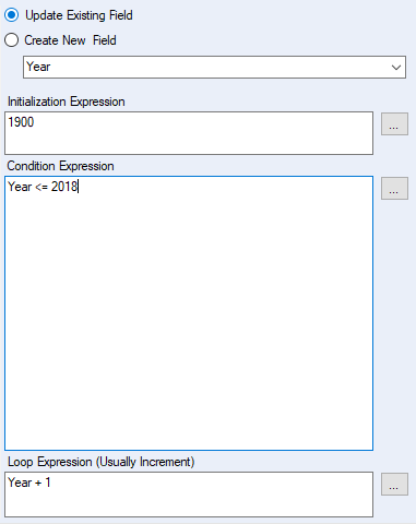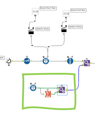 This macro relies on the user having a Year column this will get updated with the years that the end-user has from the interface tool, where they can select their start and end year. The generate rows tool will create the years from the start year - the end year with this loop expression. The start year and end year is updated through the two numeric up and down interface tools that are connected to the generate rows tool: