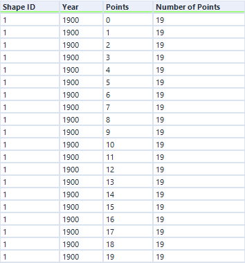 The summarise tools retrieve the maximum number of points we then append this back to our points stream, then append this section to our main data source up top. So now every year is duplicated 20 times as you can see in the example below: