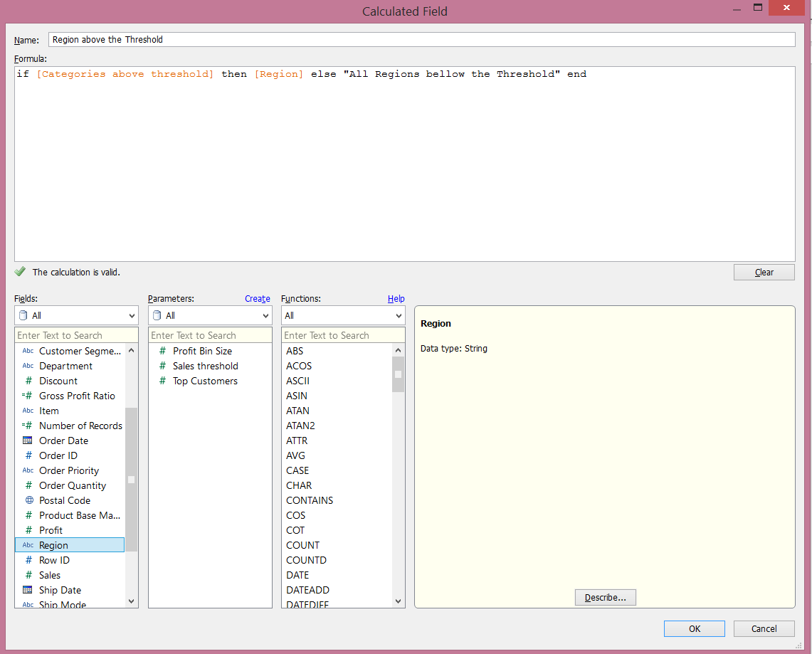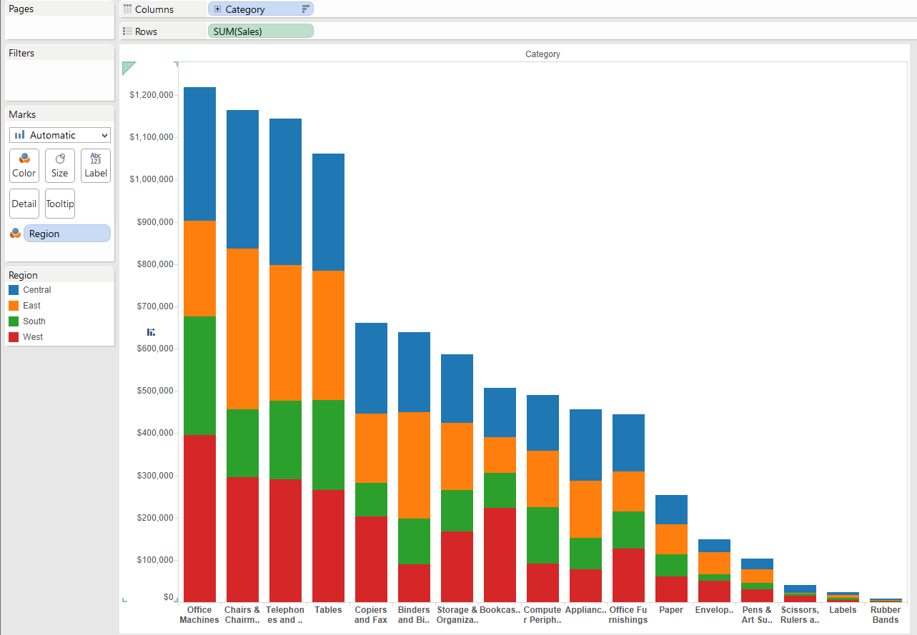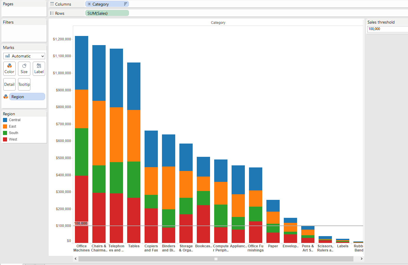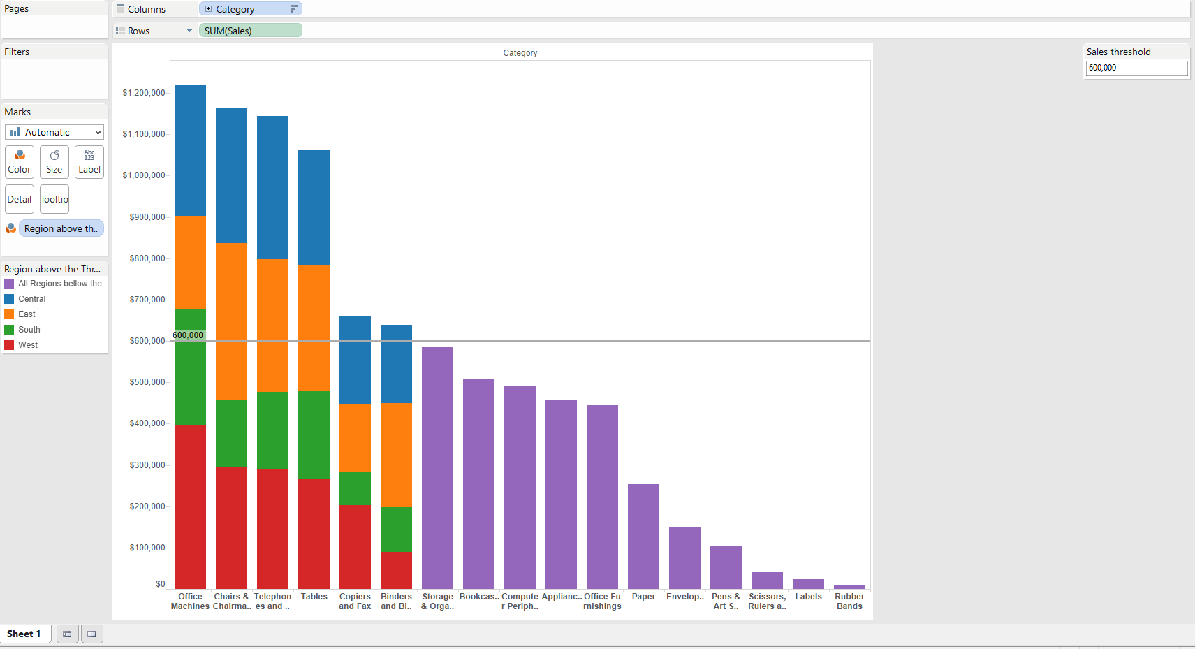 On the calculated field, we are conditioning whether or not to show regions (Central, East, Etc...), depending on whether or not if the category is below the line.This will lead us to the end of our post. We now just remove the categories filter and then replace the region field from the color mark with our new calculated field and yes, FINALLY! Finished!