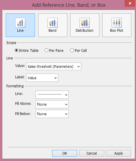 Under Scope, select Entire Table and under Line, fill in the Value for the parameter you just created, Sales threshold. Then, click ok and you will be able to see the threshold on your graph like as shown here:
