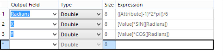 Next I simply needed to number each attribute 1 - 6 according to the spoke they took on the radar and, remembering SOHCAHTOA from my high school maths, then write the following formulae in the tool:
