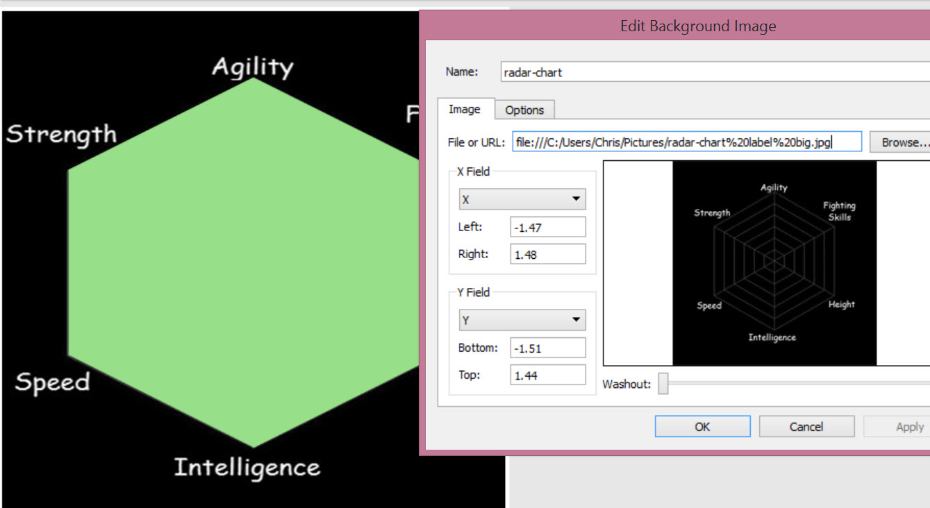 The only things to add to Andrew's post are that I created a dummy value (a hero called 'Chris'), with all the values as 1, which made lining up the template radar picture in Tableau an easier process. It meant I could tweak the X, Y coordinates and get the radar exactly right - then hide the dummy row in my final analysis:
