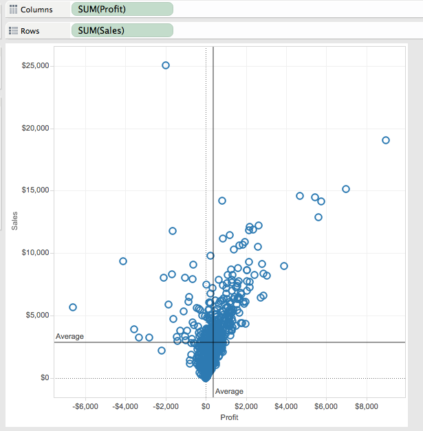 I came across an interesting challenge the other day while I was working on a client project. Although Tableau already allows users to highlight with colour legends, a filter is trickier. You could create a separate sheet and use that with a filter action (see community post here). However, in order for this hack to work, the field you are using to colour your data needs to be a dimension. What if you are colouring your data by a calculated field?Let me illustrate the problem with the go-to sample superstore data. Let’s say we want to see a scatter plot that breaks our customers into quadrants based on sales and profit. Something like this:
