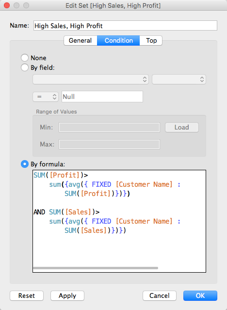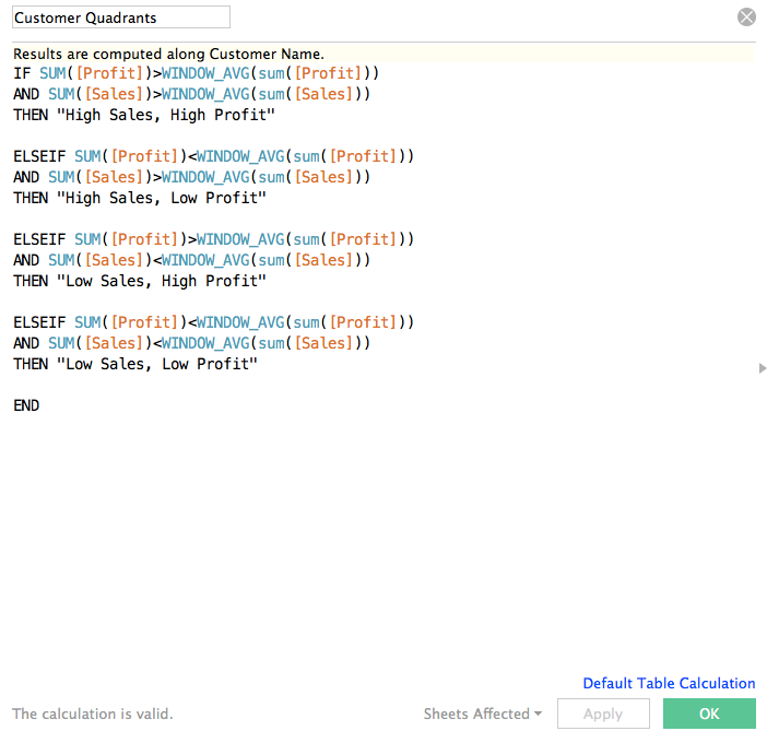 WINDOW_AVG is a table calculation that needs Customer Name as a level of detail to calculate. The problem is, we end up with too many squares. The solution? Sets. And sets don’t like table calculations. Hence, the long, drawn-out, nested LOD calc.To remedy the situation, create Customer Name sets for each of the quadrants. You can do this using the calculation we used to colour our quadrants. For example, a High Sales, High Profit set would look like this: