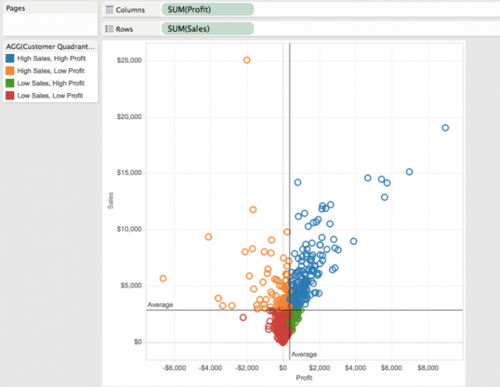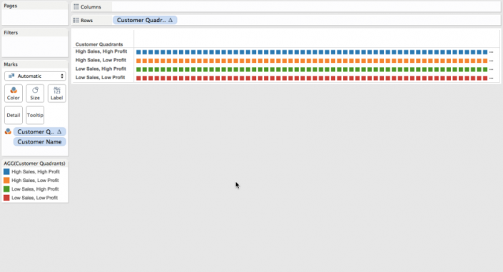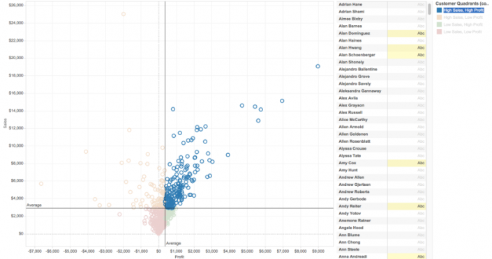 Now you have a dashboard that gives you a list of customers broken down into quadrants. A useful tool for segmentation analysis, and a good way to practice the utility of sets in Tableau.