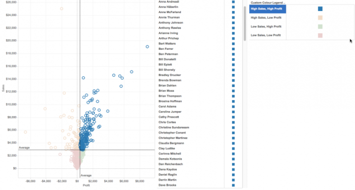 Drag this calculation onto the detail shelf in your scatterplot and customer names sheets. Create a new sheet and drag the same calculation onto the rows shelf and the colour shelf. You end up with something that looks like a colour legend. Put everything together on a dashboard and add the following actions: 1. Add a filter action between your legend sheet and name list, 2. Add a highlight action between your legend sheet and your scatterplot. You end up with something like this: