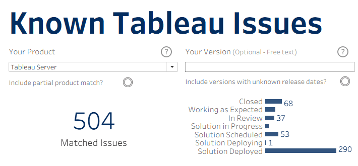 To that end, I've been working at a potential solution for a while to allow you to more easily identify issues potentially relevant to your specific scenario. The result is the dashboard below which refreshes once a week and should contain all known Tableau issues and allow a quicker, more thorough browse of potentially relevant product information!