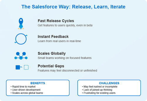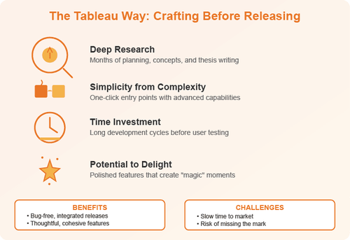 Both approaches have merit. The question isn't which is right, but rather how to combine the best of both worlds: the careful consideration and delightful simplicity of the Tableau way with the rapid iteration and user feedback of the Salesforce way. The organisations that solve this puzzle will be the ones that truly serve their users well.